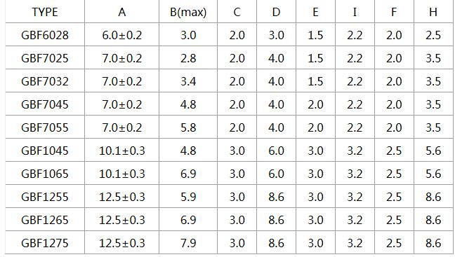 四、屏蔽電感GBF封裝尺寸列表: